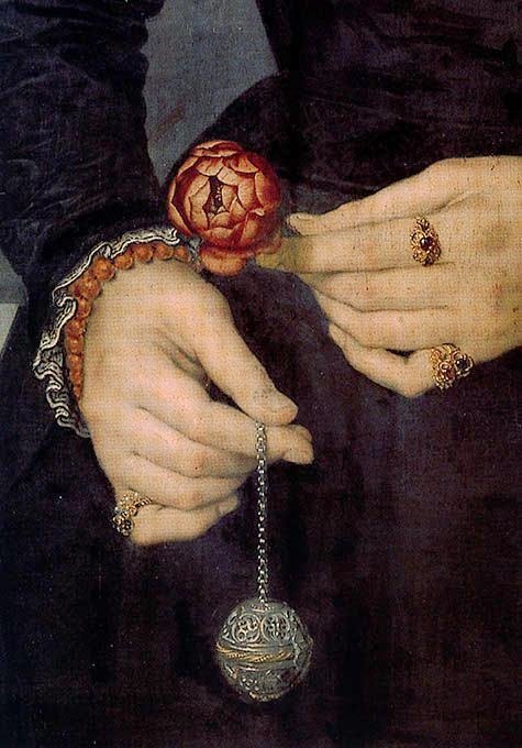 A palavra pomander vem do francês antigo pomme d’ambre, que significa "maçã de âmbar". Era um tipo de esfera perfumada feita com uma mistura de resinas, ervas e especiarias, muitas vezes colocada dentro de uma cápsula de metal (que podia ser super pomposa ou não) usada como amuleto ou colar.